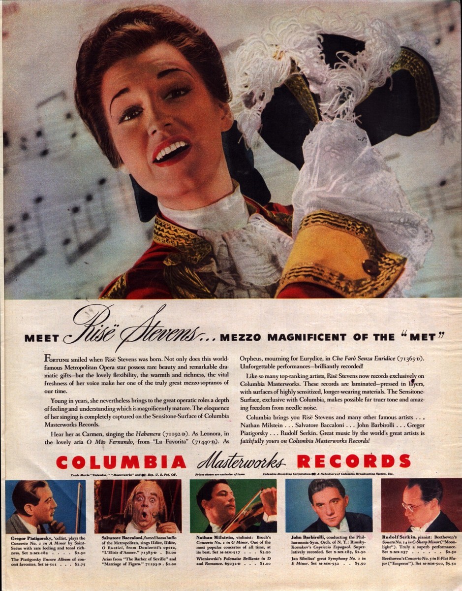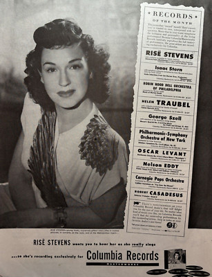 My mother always raved about Risë Stevens. In my mind this singer was larger than life and possessed a voluptuous sexy sound. She was an amazing beauty too and had a really exotic name. As far I knew, she was the only opera singer in the world even though Robert Merrill and Jan Pierce were also on the recording. Mom, being a mezzo/contralto only spoke of Risë Stevens. I cannot help but think this early exposure influenced my choice of being a mezzo with high notes.
