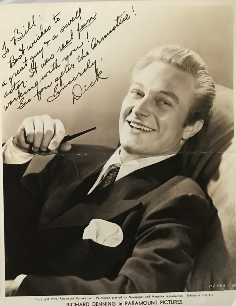 Born in Poughkeepsie, New York, Louis Albert Denninger Jr. was the son of a garment manufacturer who relocated and set up shop in Los Angeles when Louis Jr. was 18 months old. After finishing school, Denninger enrolled at Woodbury Business College and majored in business and accounting, graduating cum laude with a master’s in business administration. But Denninger, who never liked accounting, started becoming involved in little theater groups as a hobby and was encouraged to compete in a radio contest called “Do You Want to Be an Actor?”, winning a screen test at Warner Brothers. Warners wasn’t interested in him because he looked too much like another well-known actor under contract, but by now he had his heart set on a movie career. Denninger was soon signed by Paramount, who insisted on changing his name (to “Richard Denning”) because his real name, Denninger, sounded too much like gunman John Dillinger’s. He retired and moved to Maui but was asked to play the governor in TV’s Hawaii Five-O (1968). He agreed to play the governor as long as he didn’t have to be in every episode. It ran for 12 years, ending in 1980. Five years later, his actress-wife Evelyn Ankers died at their up-country Maui home (cancer). “I’m very grateful for a career that wasn’t spectacular, but always made a good living or filled in “in-between,” Denning said of his acting days. “I have wonderful memories of it, but I don’t really miss it.”